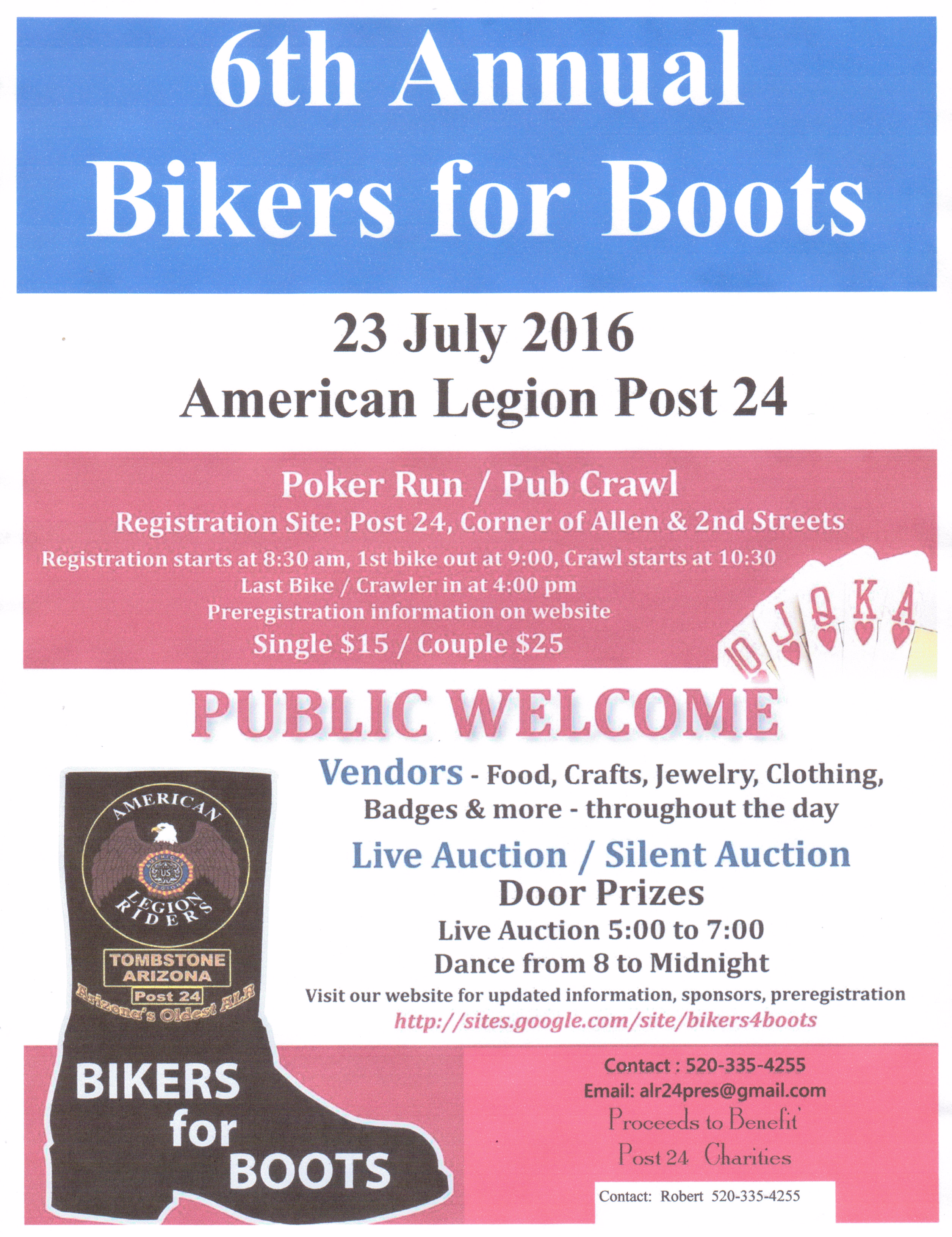 The 6th Annual Biker for Boots Poker Run/Pub Crawl will be on July 23, 3016. Registration site is Post 24 on the corner of Allen & 2nd Street, Tombstone. Registration starts @ 8:30, 1st bike out @ (:00 and crawl starts @ 10:30. Last bike/crawler must be in by 4:00. You can do the Poker Run or the Pub Crawl. Lots of Vendors, food, crafts, etc.