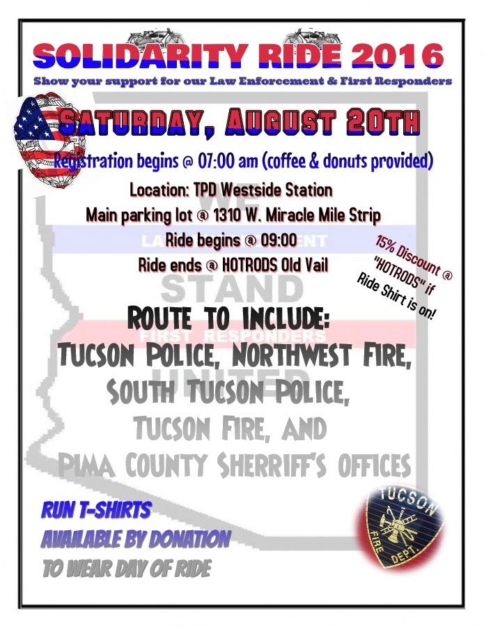 There will be a solidarity Ride on Saturday August 20th. Registration begins @ 7:00 am (coffee & donuts) @ TPD West-side Station, main parking lot, 1310 W. Miracle Mile Strip. Ride begins @ 9:00 and will end @ “Hotrods” Old Vail. Run t-shirts will be available by donation and are to be worn the day of the ride. The ride will be throughout Tucson with the route passing many TPD stations, NW Fire, South TPD, Tucson Fire, and Pima County Sheriff’s offices. ONE HUNDRED PERCENT, 100% will be given to the above mentioned departments. Also 15% discount @ “Hotrods” plus drinks specials if wearing your Run shirt after the ride.